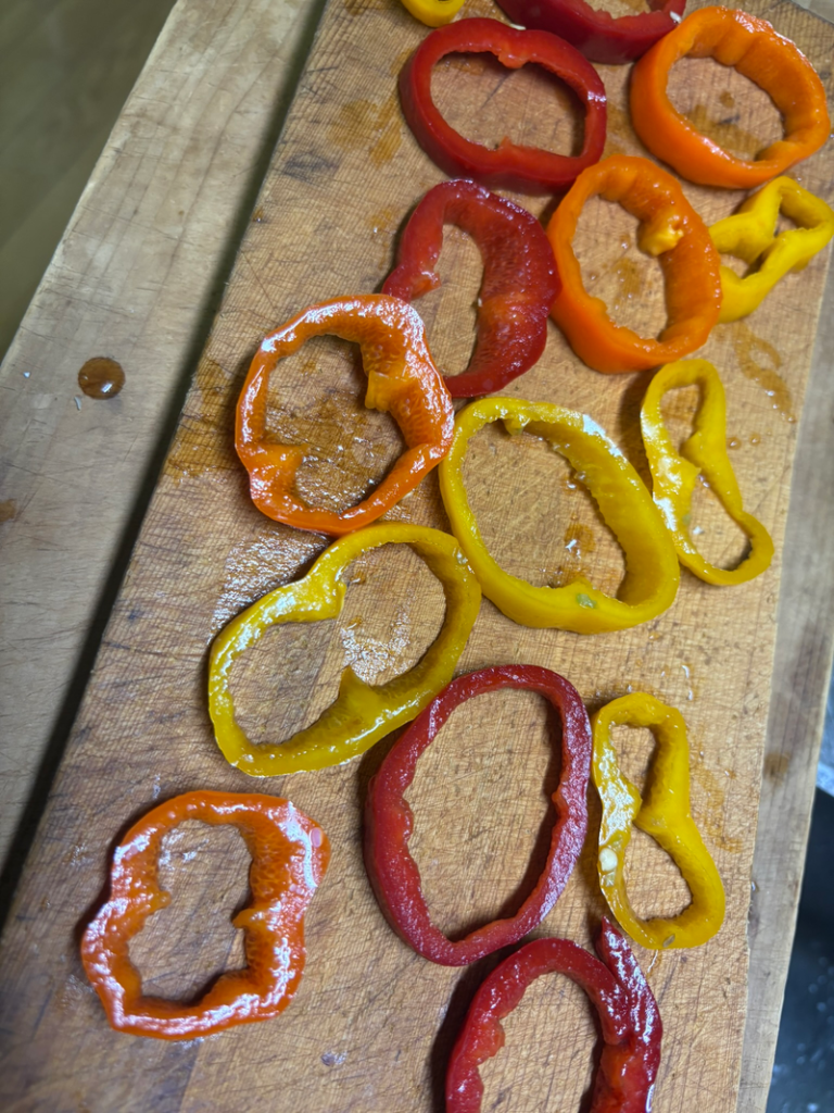 焼くうちにお肉が縮んでしまい、パプリカからはがれてしまいました。