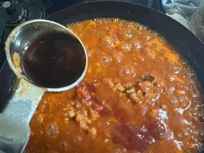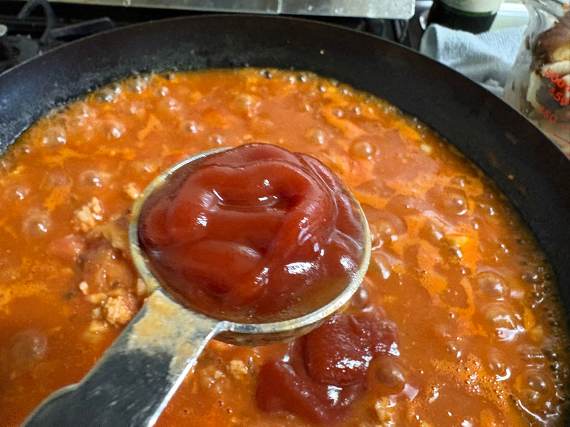 トマト缶、ケチャップ、ウスターソース、味噌、塩こしょうを加えて全体をよく混ぜます。